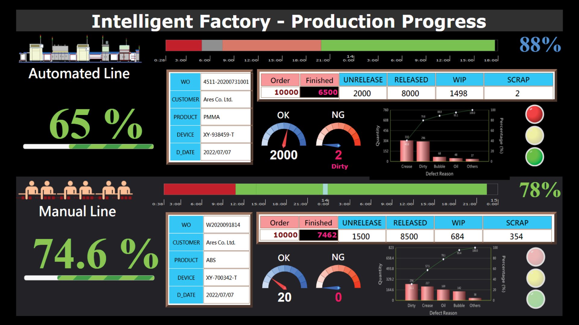 OEE is a key metric for measuring and indicating the effectiveness of a production system within an organization. A higher OEE signifies that production is more aligned with the set goals. However, if the OEE is low, business operators should take steps to improve it in order to enhance production efficiency. The MES system from ARES is designed to manage, monitor, and plan production while providing real-time OEE metrics without the need for manual calculation. This enables operators to precisely improve machine operations and other factors within the system.